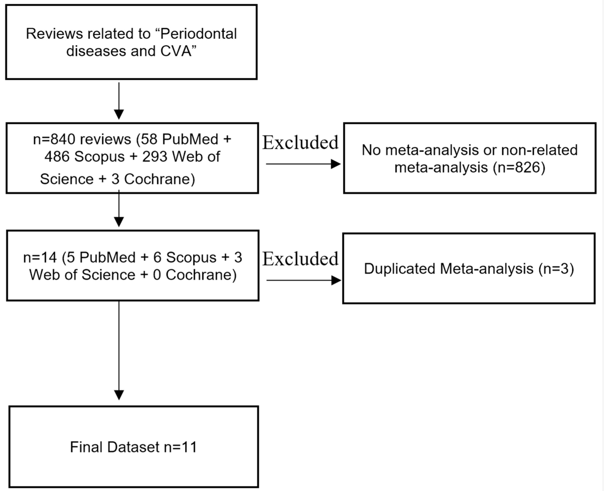 Les maladies cérébrovasculaires (MCV) ont plusieurs facteurs de risque qui sont classés comme modifiables et non modifiables. Les maladies parodontales (MP) ont un rôle modifiable dans la survenue des AVC, plusieurs études ayant suggéré des corrélations directes ou indirectes avec les maladies systémiques. Cette étude a pour but de résumer, d’évaluer et d’analyser toutes les preuves disponibles dans la littérature, afin de mieux comprendre la relation entre la parodontite, la gingivite, la perte de dents et les AVC. Les bases de données PubMed, Cochrane, Scopus et Web of Science ont été recherchées pour toutes les méta-analyses évaluant l’effet de la MP sur l’AVC, conformément aux directives du Joanna Briggs Institute pour les revues générales en mars 2024. L’évaluation des revues systématiques multiples (AMSTAR) a été utilisée pour l’évaluation de la qualité. Une analyse groupée a été réalisée pour évaluer l’effet de la parodontite, de la gingivite et de la perte de dents sur l’AVC, en fonction de la disponibilité des données, à l’aide de Review Manager Version 5.2.11. Sept méta-analyses ont été identifiées comme étant de grande qualité, et elles étaient réparties dans différents pays. La parodontite était généralement associée à une augmentation significative du risque d’AVC (OR = 2,32, 95% CI : 1,70, 3,17, p < 0,00001 et RR = 1,22, 95% CI : 1,15-1,29, p < 0,00001), tout comme la perte de dents, mais à un degré moindre (0,78). Cependant, l’effet de la gingivite n’était pas significatif en termes d’AVC (RR = 1,32, IC à 95 % : 1,12-1,56, p = 0,0008). Cette étude confirme l’effet de la parodontite et de la perte de dents sur l’AVC, sans tenir compte du rôle significatif de la gingivite. La relation obtenue favorise le rôle suggéré de certains changements inflammatoires dans la voie pathogène menant aux changements athérosclérotiques.