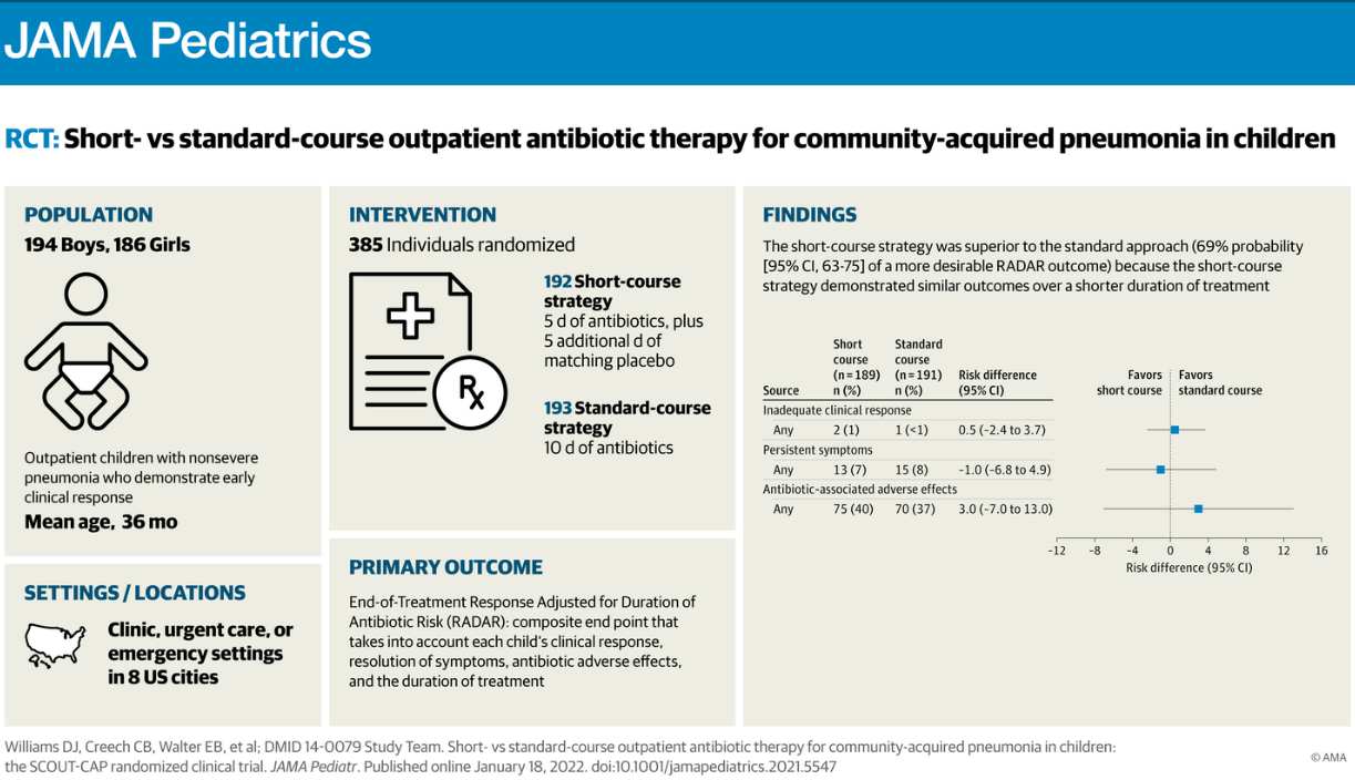 Fournir la plus courte durée d’antibiotiques nécessaire pour traiter efficacement une infection est un principe central de la gestion des antibiotiques et une stratégie pratique et rentable. Cette étude a recruté des enfants âgés de 6 mois à 6 ans diagnostiqués avec une Pneumopathie aiguë communautaire (PAC) non compliquée avec une amélioration clinique précoce suite à 5 jours d’antibiothérapie. L’amoxicilline, l’amoxicilline avec l’acide clavulanique, le cefdinir (C3G) sont les trois types de traitements proposés. Les patients ont été randomisés au 6e jour pour passer à 5 jours supplémentaires de traitement antibiotique initialement prescrit ou à un placebo. Le critère d’évaluation principal était la réponse à la fin du traitement. Au total, 380 enfants ont participé à l’étude. L’âge moyen des participants était de 35,7 mois, et la moitié étaient des garçons. Plus de 90 % des enfants randomisés ont reçu de l’amoxicilline. La stratégie antibiotique de 5 jours avait une probabilité de 69 % (IC à 95 %, 63 % - 75 %) que les enfants obtiennent un résultat plus souhaitable par rapport au traitement standard de 10 jours. Il n’y avait pas non plus de différences significatives entre les deux groupes dans la persistance des symptômes. A noter que 40 % des enfants affectés à la stratégie de courte durée et 37 % des enfants affectés à la stratégie de 10 jours ont signalé un Effet indésirable lié aux antibiotiques, dont la plupart étaient légers. 171 enfants ont été inclus dans une analyse sur les résistances (gènes de résistance aux antibiotiques dans la flore oropharyngée). Le nombre total de gènes de résistance par cellule procaryote était significativement plus faible chez les enfants traités avec des antibiotiques pendant 5 jours par rapport aux enfants traités pendant 10 jours.