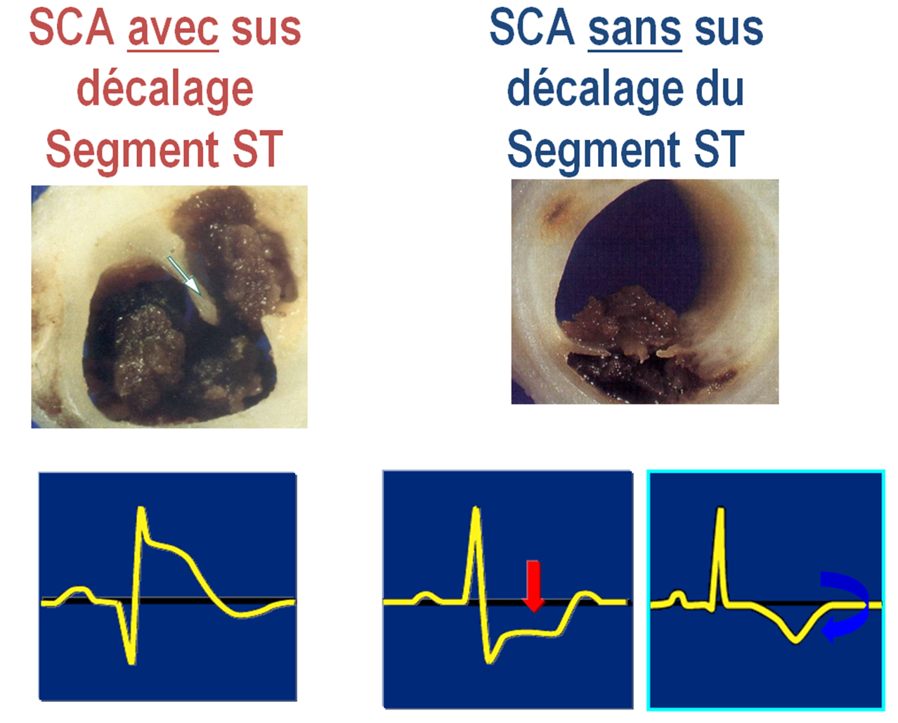 - le SCA ST + défini par une douleur angineuse trinitro-résistante continue et récente (moins de 6h) avec à l’ECG :